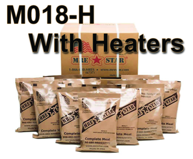 Each MRE Case includes 12 Single Complete MRE Meals – Standard Variety With Heaters.